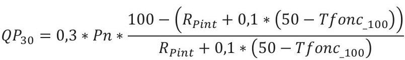 gt;100 \%$ ). Dans les équations pour le calcul du rendement de génération, ils sont donc convertis en PCS (en les divisant par $\mathrm{k}_{P C S / P C I}$ ). Le DPE exprimant les consommations en kWh PCI , les rendements de génération calculés en PCS sont ensuite convertis en PCI pour leur calcul. De même, les pertes à l'arrêt $Q_{\text {po }}$ et les puissances des veilleuses Pveil sont données pour du PCI. Pour les avoir pour du PCS avant de les utiliser dans les calculs, elles doivent être multipliées par le coefficient de conversion $\mathrm{k}_{P C S / P C I}$ Selon les énergies, le coefficient de conversion en $\mathrm{PCI} / \mathrm{PCS}$ est donné dans le tableau suivant : | Coefficient de conversion $\mathrm{k}_{P C S / P C I}$ | | | :---: | :---: | | Electricité | 1 | | Gaz naturel | 1,11 | | GPL | 1,09 | | Fioul | 1,07 | | Bois | 1,08 | | RCU | 1 | | Charbon | 1,04 | ### 13.2.1.5 Chaudières basse température et condensation : Pour les chaudières basse température et condensation, le point de fonctionnement w correspond à un fonctionnement à $15 \%$ de charge. Entre 0 et $15 \%$ de charge : $ Q P_{x}=\frac{\left[Q P_{15}-0,15 \cdot Q P_{0}\right] * x}{0,15}+0,15 * Q P_{0} $ Entre 15 et $30 \%$ de charge : $ Q P_{x}=\frac{\left[Q P_{30}-Q P_{15}\right] * x}{0,15}+Q P_{15}-\frac{\left[Q P_{30}-Q P_{15}\right] * 0,15}{0,15} $ Entre 30 et $100 \%$ de charge : $ \begin{gathered} Q P_{x}=\frac{\left[Q P_{100}-Q P_{30}\right] * x}{0,7}+Q P_{30}-\frac{\left[Q P_{100}-Q P_{30}\right] * 0,3}{0,7} \\ Q P_{15}=\frac{Q P_{30}}{2} \end{gathered} $ **Pour les chaudières basse températures:** - S'il y a une régulation : ![[Pasted image 20240909234513.png]] - En l'absence de régulation :   **Pour les chaudières à condensation :** - S'il y a une régulation : $Q P_{30}=0,3*P n*\frac{100-\left(R_{P i n t}+0,2*\left(33-T f o n c_{-30}\right)\right)}{R_{P i n t}+0,2*\left(33-T f o n c_{-30}\right)}$ - En l'absence de régulation: $ Q P_{30}=0,3 * P n * \frac{100-\left(R_{\text {Pint }}+0,2 *\left(33-\text { Tfonc }_{1} 100\right)\right)}{R_{\text {Pint }}+0,2 *\left(33-\text { Tfonc }_{\_} 100\right)} $ $ Q P_{100}=P n * \frac{100-\left(R_{P n}+0,1 *\left(70-\text { Tfonc }_{1} 100\right)\right)}{R_{P n}+0,1 *(70-\text { Tfonc } 100)} $ Tfonc_100 $\left({ }^{\circ} \mathrm{C}\right.$ ) est la température de fonctionnement de la chaudière à $100 \%$ de charge. Elle est donnée dans le tableau suivant en fonction des types d'émetteur et des différentes périodes de leur installation : | | Période | | | | :---: | :---: | :---: | :---: | | Température de distribution / Type <br> d'émetteur | Avant 1981 | Entre 1981 et <br> 2000 | Après 2000 | | Basse / Plancher ou plafond basse <br> température | 60 | 35 | 35 | | Moyenne / Radiateur à chaleur douce | 80 | 70 | 60 | | Haute / Autres émetteurs | 80 | 70 | 70 | Tfonc_ $30\left({ }^{\circ} \mathrm{C}\right.$ ) est la température de fonctionnement de la chaudière à $30 \%$ de charge. Elle est donnée dans les tableaux suivants selon le type d'installation. **Pour les chaudières à condensation :** | | Période (émetteurs) | | | | :------------------------------------------------: | :-----------------: | :---------------------: | :--------: | | Température de distribution / Type <br> d'émetteur | Avant 1981 | Entre 1981 et <br> 2000 | Après 2000 | | Basse / Plancher ou plafond basse <br> température | 32 | 24,5 | 24,5 | | Moyenne / Radiateur à chaleur douce | 38 | 35 | 32 | | Haute / Autres émetteurs | 38 | 35 | 35 | **Pour les chaudières basse température : | | Période (émetteurs) | | | | :------------------------------------------------: | :-----------------: | :---------------------: | :--------: | | Température de distribution / Type <br> d'émetteur | Avant 1981 | Entre 1981 et <br> 2000 | Après 2000 | | Basse / Plancher ou plafond basse <br> température | 42,5 | 35 | 35 | | Moyenne / Radiateur à chaleur douce | 48,5 | 45,5 | 42,5 | | Haute / Autres émetteurs | 48,5 | 45,5 | 45,5 | Si un système de génération alimente des réseaux de distribution de températures différentes, la température de fonctionnement est prise égale à la température maximale. Pour les installations récentes ou recommandées, les caractéristiques réelles des chaudières présentées sur les bases de données professionnelles peuvent être utilisées. Si l'année d'installation des émetteurs est inconnue, prendre l'année de construction du bâtiment. ### 13.2.1.6 Chaudières standard Pour les chaudières standards, le point de fonctionnement w correspond à un fonctionnement à $30 \%$ de charge, Entre 0 et $30 \%$ de charge : $ Q P_{x}=\frac{\left[Q P_{30}-0,15 * Q P_{0}\right] * x}{0,3}+0,15 * Q P_{0} $ Entre 30 et $100 \%$ de charge : $ Q P_{x}=\frac{\left[Q P_{100}-Q P_{30}\right] * x}{0,7}+Q P_{30}-\frac{\left[Q P_{100}-Q P_{30}\right] * 0,3}{0,7} $ - S'il y a une régulation  - En l'absence de régulation  $ \begin{aligned} & Q P_{100}=P n * \frac{100-\left(R_{P n}+0,1 *\left(70-\text { Tfonc }_{\_} 100\right)\right)}{R_{P n}+0,1 *\left(70-\text { Tfonc }_{\_} 100\right)} \end{aligned} $ Avec : - Tfonc $\_100\left({ }^{\circ} \mathrm{C}\right.$ ) : température de fonctionnement de la chaudière à $100 \%$ de charge. Elle est donnée dans le paragraphe précédent pour les chaudières basse température et condensation - Tfonc $_{30}\left({ }^{\circ} \mathrm{C}\right)$ : température de fonctionnement de la chaudière à $30 \%$ de charge. Elle est donnée selon le type d'installation dans les tableaux suivants **Pour une chaudière standard, jusqu'en 1990 : | | Période (émetteurs) | | | | :---: | :---: | :---: | :---: | | Température de distribution / Type <br> d'émetteur | Avant 1981 | Entre 1981 et <br> 2000 | Après 2000 | | Basse / Plancher ou plafond basse <br> température | 53 | 50 | 50 | | Moyenne / Radiateur à chaleur <br> douce | 59 | 56 | 53 | | Haute / Autres émetteurs | 59 | 56 | 5